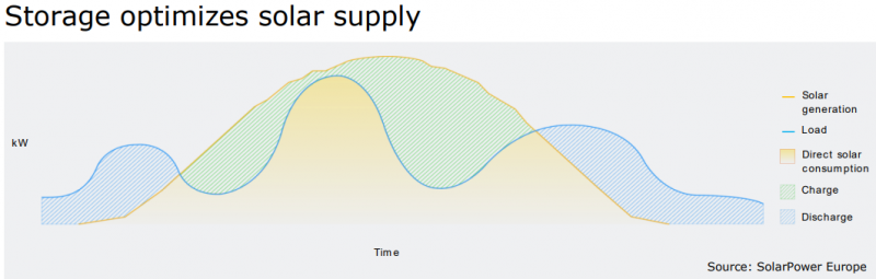 首先,我們從光伏發(fā)電特點(diǎn)和電網(wǎng)用電特點(diǎn)來看。圖一黃色的光伏發(fā)電曲線的計(jì)算模型中,僅有部分與用電曲線重合。裝配儲能系統(tǒng)后,當(dāng)光伏發(fā)電量大于用電量,儲能處于充電狀態(tài);當(dāng)用電量大于光伏發(fā)電量,儲能處于放電狀態(tài)。儲能系統(tǒng)充當(dāng)了一個(gè)很好的“能源調(diào)節(jié)器”,從而解決了“棄光”這個(gè)問題