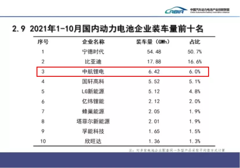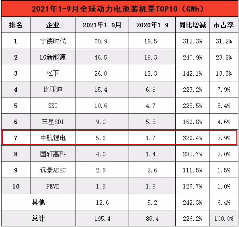 在10月底韓國市場研究機(jī)構(gòu)SNE Research公布的2021年1-9月全球動力電池裝車量排行榜中,中航鋰電以5.6GWh的動力電池裝車量,位居第七。