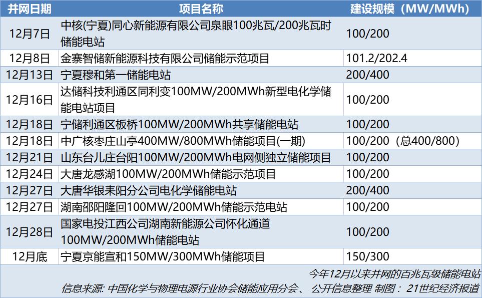 21世紀(jì)經(jīng)濟(jì)報(bào)道記者根據(jù)公開信息不完全統(tǒng)計(jì)發(fā)現(xiàn),截至12月28日,本月已有28個(gè)新型儲(chǔ)能項(xiàng)目完成并網(wǎng)交付。這其中,不乏數(shù)十個(gè)百兆瓦級(jí)容量的大型地面電站、獨(dú)立共享儲(chǔ)能電站順利并網(wǎng),也誕生了多個(gè)地方儲(chǔ)能電站的規(guī)模之最、建設(shè)速度之最。事實(shí)上,這也為明年國內(nèi)大型儲(chǔ)能電站的推進(jìn)立下了樂觀的預(yù)期。