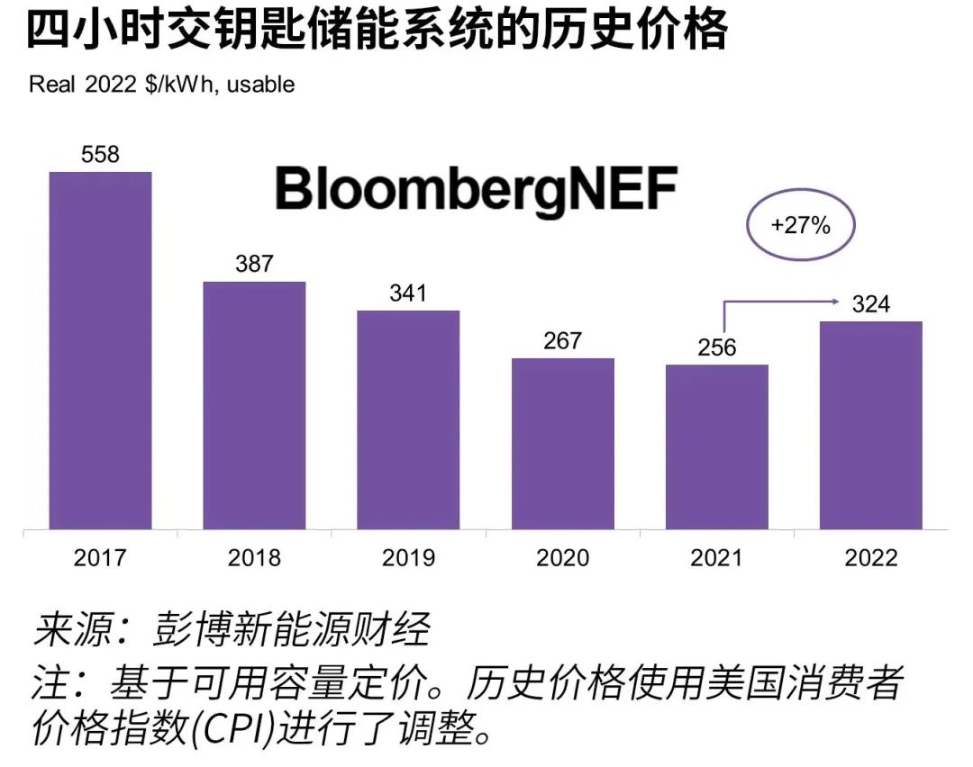 彭博新能源財經(jīng)2022年調(diào)研的交鑰匙儲能系統(tǒng)價格區(qū)間為每千瓦時212美元至575美元,四小時系統(tǒng)的全球平均價格比去年上漲27%至每千瓦時324美元。原材料和零部件價格上漲導(dǎo)致了儲能系統(tǒng)價格上漲,這也是自彭博新能源財經(jīng)于2017年開始調(diào)研以來的首次上漲。預(yù)計成本將在2023年保持高位,然后在2024年下降。本報告匯總了提交的185份調(diào)研數(shù)據(jù),并且包括彭博新能源財經(jīng)對儲能成本的最新展望。