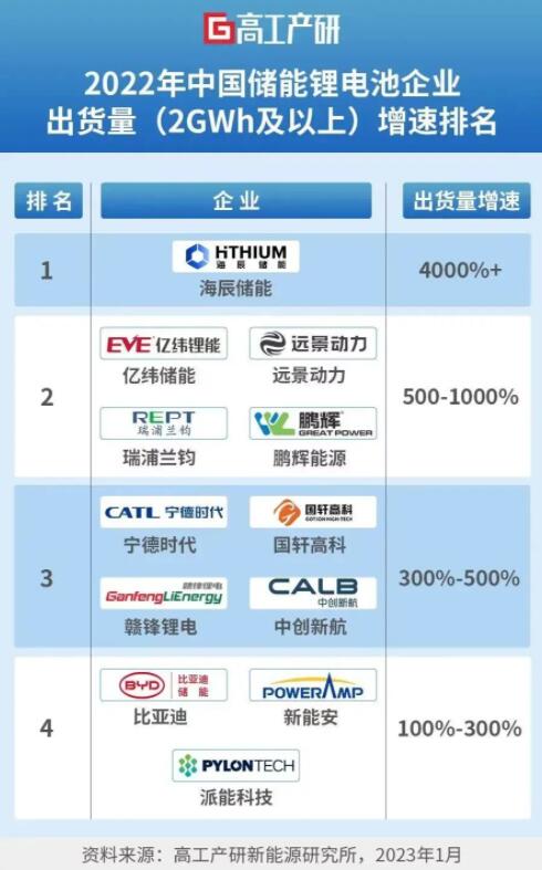 而從出貨量增速來看,2022年增速排名第一的為海辰儲能,達40倍以上。億緯鋰能、遠景動力、瑞浦蘭鈞、鵬輝能源排名第二檔,增速在5倍-10倍之間。寧德時代、國軒高科、贛鋒鋰電、中創(chuàng)新航位列第三檔,增速達3倍-5倍。比亞迪、派能科技、新能安出貨量增速達1倍-3倍。
