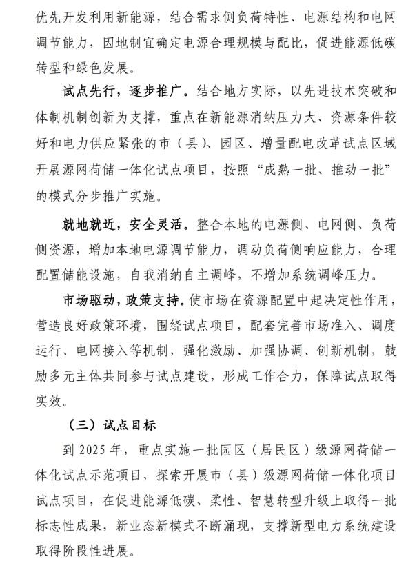 試點目標:到2025年,重點實施一批園區(qū)(居民區(qū))級源網(wǎng)荷儲一體化試點示范項目,探索開展市(縣)級源網(wǎng)荷儲一體化項目試點項目,在促進能源低碳、柔性、智慧轉(zhuǎn)型升級上取得一批標志性成果,新業(yè)態(tài)新模式不斷涌現(xiàn),支撐新型電力系統(tǒng)建設取得階段性進展。
