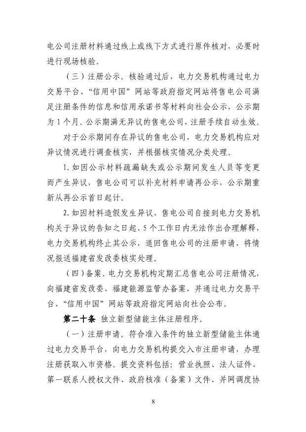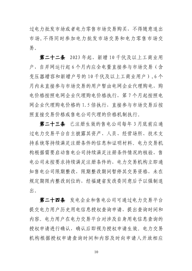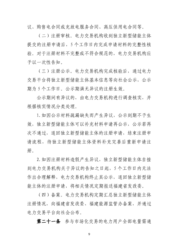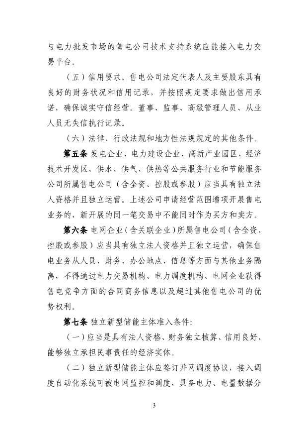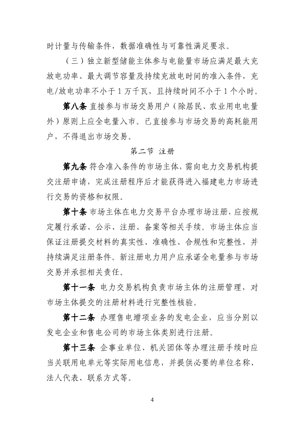 (三)獨(dú)立新型儲(chǔ)能主體參與電能量市場(chǎng)應(yīng)滿足最大充 放電功率、最大調(diào)節(jié)容量及持續(xù)充放電時(shí)間的準(zhǔn)入條件,充 電/放電功率不小于 1 萬(wàn)千瓦,且持續(xù)時(shí)間不小于 1 個(gè)小時(shí)。 第八條 直接參與市場(chǎng)交易用戶(除居民、農(nóng)業(yè)用電電量 外)原則上應(yīng)全電量入市。已直接參與市場(chǎng)交易的高耗能用 戶,不得退出市場(chǎng)交易。