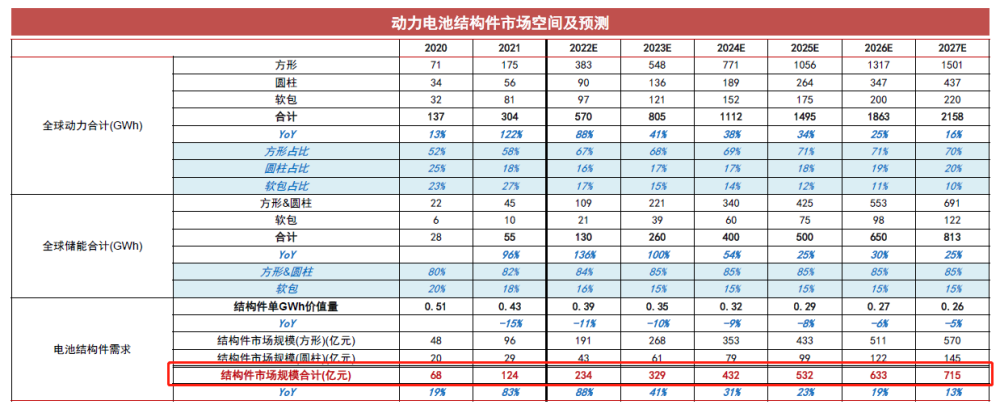 電池結(jié)構(gòu)件位于鋰電池行業(yè)上游,單GWh價(jià)值量與負(fù)極、隔膜電解液相當(dāng)。受益于全球新能源汽車、儲(chǔ)能行業(yè)的高景氣度增長(zhǎng),方形、圓柱電池需求增長(zhǎng),袁健聰預(yù)計(jì)2025年全球電池結(jié)構(gòu)件行業(yè)市場(chǎng)空間約532億元,相比2022年市場(chǎng)空間翻倍,對(duì)應(yīng)2022-2025年CAGR為31%。