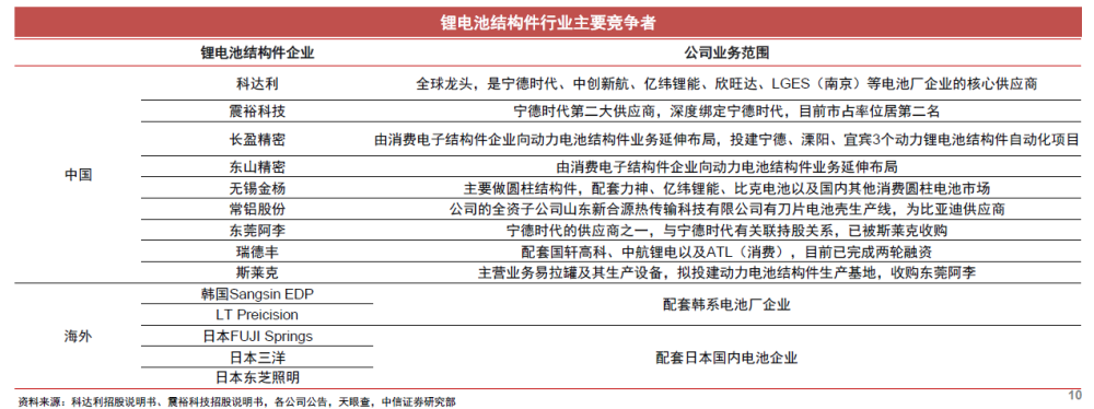 科達(dá)利為行業(yè)龍頭,最早布局動(dòng)力電池結(jié)構(gòu)件業(yè)務(wù),具備技術(shù)、產(chǎn)能規(guī)模優(yōu)勢(shì),是下游大客戶寧德時(shí)代、LGES、中創(chuàng)新航等主流電池廠的核心供應(yīng)商。行業(yè)龍二為震裕科技,是寧德時(shí)代的另一大核心供應(yīng)商。此外還有長(zhǎng)盈精密、東山精密、無(wú)錫金楊、常鋁股份、東莞阿李、瑞德豐、斯萊克等競(jìng)爭(zhēng)者(如圖)。