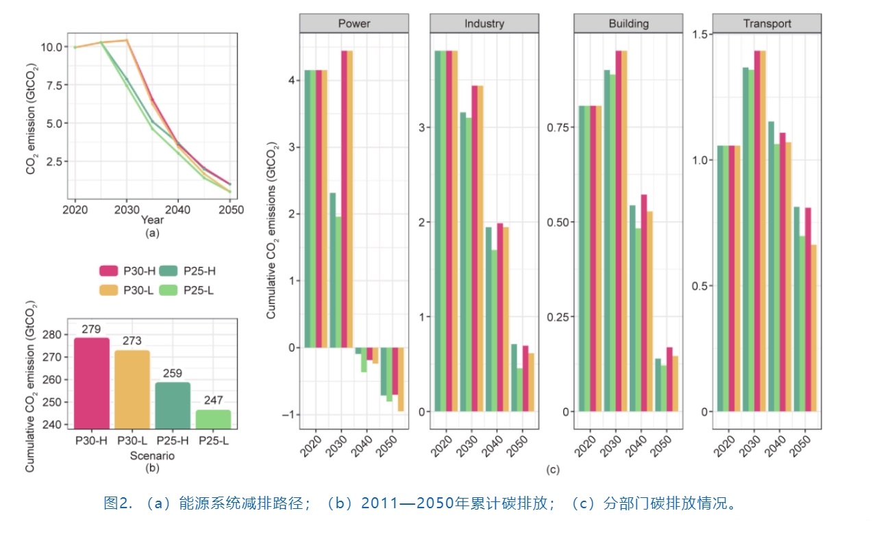 通過多情景比較發(fā)現(xiàn),提前達峰能夠給中國更多的時間來安排煤電廠的有序退役和可再生能源的平穩(wěn)部署。雖然提前達峰在短期內可能會有更大的轉型壓力,但從長遠來看,這是最具有成本效益的選擇。同時,提前達峰帶來的累計排放量減少,也將縮小21世紀下半葉對于負排放的大量需求。盡管4個情景2050年局地空氣污染物的排放差異不大,但是提前實現(xiàn)碳達峰將導致未來15年的空氣質量得到明顯改善。2050年更低的排放值會增加整體的減排壓力,這將導致可再生能源和負排放技術的進一步擴張。需求部門在能源轉型中也將通過減少能源需求(但增加福利損失)、使用高成本技術(大規(guī)模使用氫能)等策略來應對更為嚴格的排放約束。