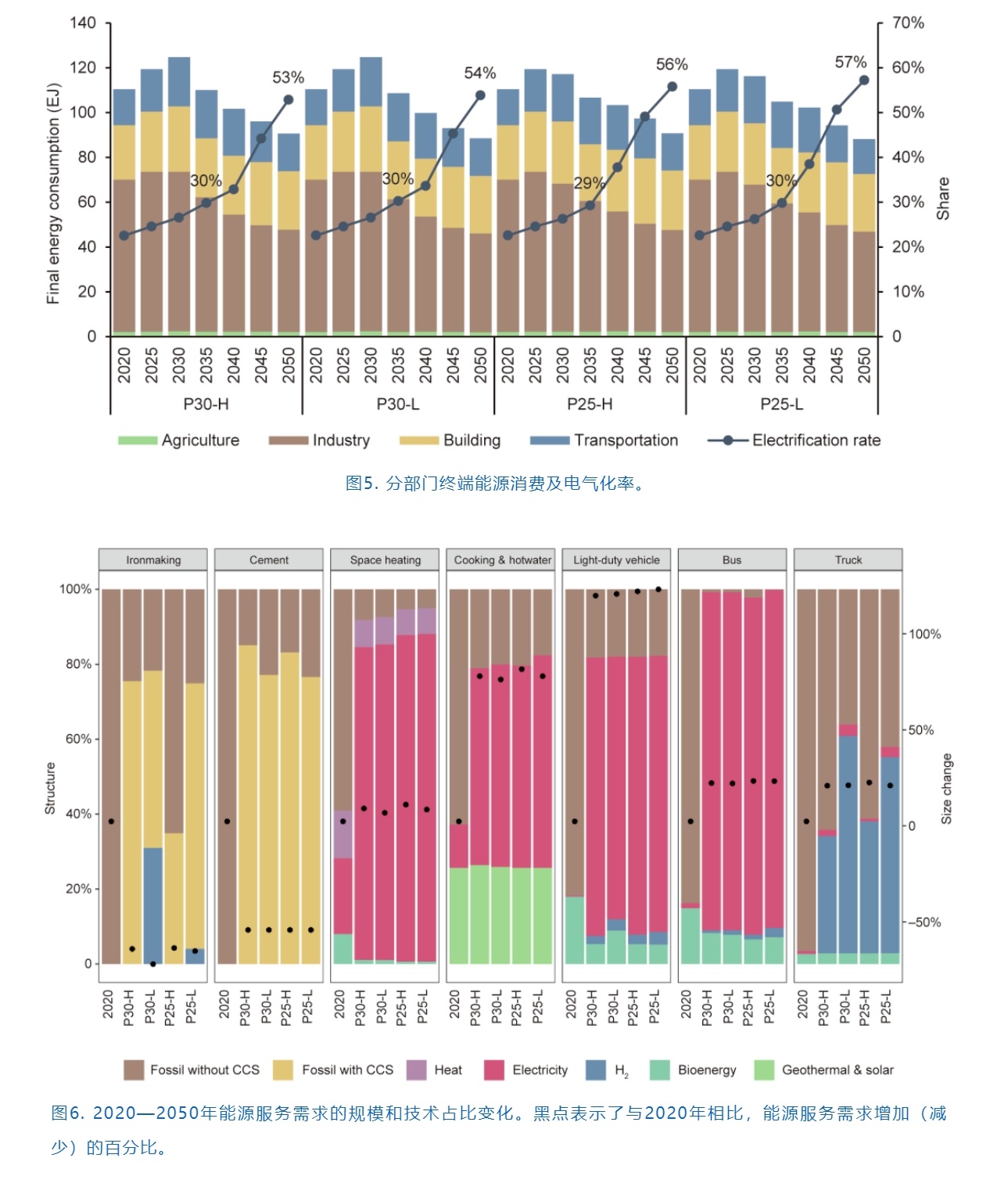 產業(yè)結構調整、能源效率提高和清潔燃料替代是能源需求部門能耗和排放下降的三大支柱。據(jù)估計,第二產業(yè)在國民經濟中的比重逐年下降,到2050年,這一比重將比2020年減少約9%,而第三產業(yè)比重將增加10%。如圖5所示,對于P30情景,中國的終端能源消費將在2030年以125 EJ達峰,而對于P25情景,達峰時間將提前到2025年左右,峰值水平也略低(119 EJ)。兩組情景都顯示,2050年中國終端能源消費將穩(wěn)定在90 EJ左右。未來的30年,電氣化率將持續(xù)上升,從目前的23%增加到2035年的30%,然后加速達到2050年的近60%。技術進步和終端能源的電氣化推動能源效率的快速提高。在圖6中,部分能源服務需求的規(guī)模以及技術占比變化以圖表的形式展示。