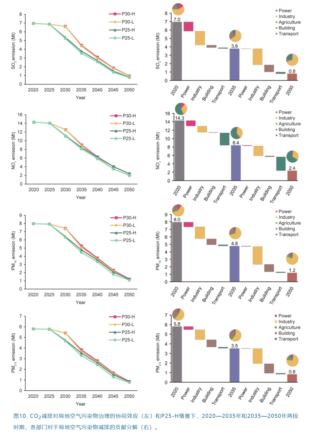 對比不同情景,在2025—2035年,上述4種局地污染物的排放在碳達峰時間不同的情景下會有明顯的不同。與P30情景相比,P25情景在2030年的SO2、NOx、PM10、PM2.5排放分別減少21%、12%、15%和14%。因此,盡管不同情景下2050年的排放趨于一致,盡早開始碳減排都將產生更多的近期收益。