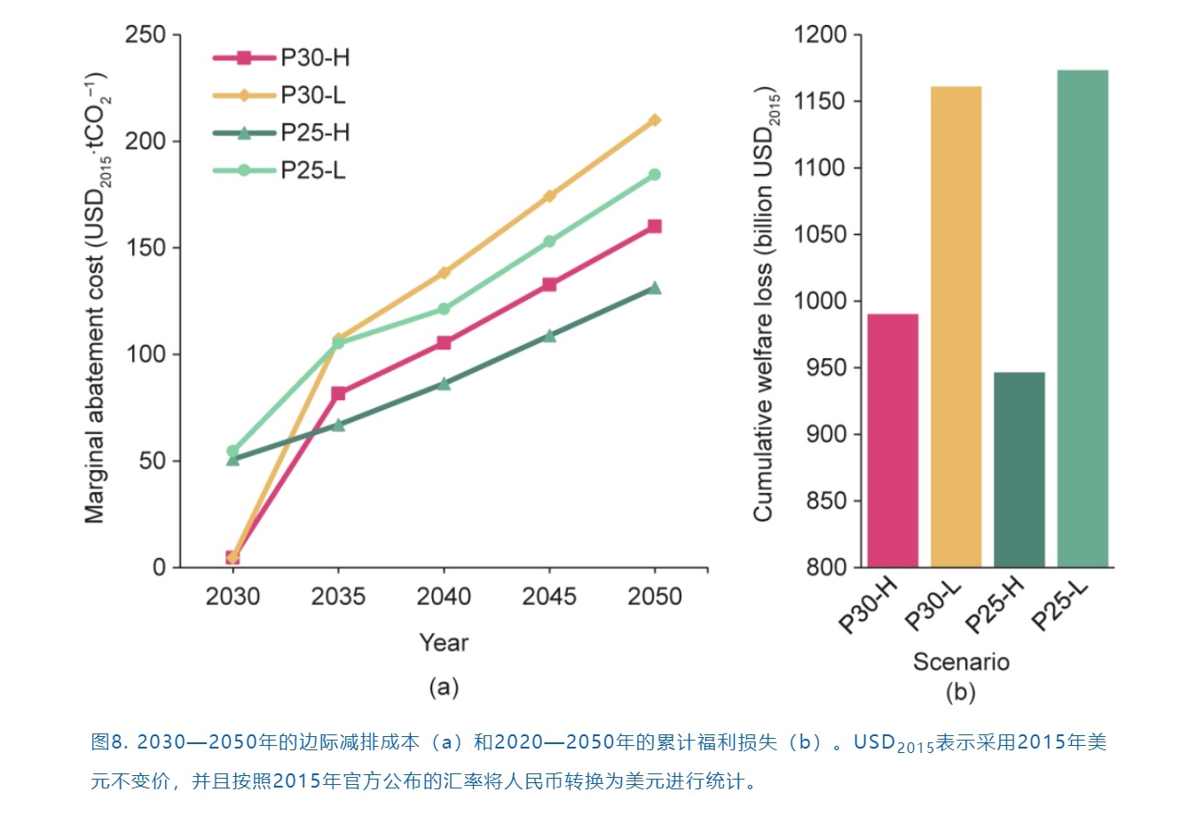福利損失是另一個用于衡量轉型成本的指標。MAC關注的是減排的難度,而福利損失衡量了減排對于消費者和生產者產生的影響。圖8(b)顯示,相較于僅實現(xiàn)國家自主貢獻目標的基準情景,在2020—2050年,碳中和情景的累計福利損失為0.947~1.173萬億美元。2050年碳預算較低的情景(P25-L和P30-L)的福利損失將比另外兩個情景高17%~24%,而達峰時間對于福利損失和能源服務需求的變化影響較小。