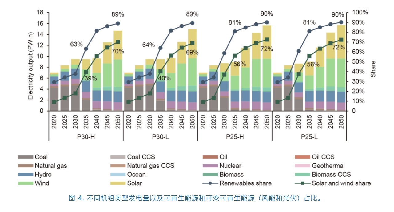 發(fā)電結構的變化主要是因為煤電廠的退役和風能及光伏發(fā)電的增加。可以預計,煤電廠將很快進入轉型最關鍵的10年。在此期間,煤電廠要么需要提前退役,要么將進行靈活性改造以進入輔助服務市場,或者轉變?yōu)樯镔|-煤混燃電廠甚至純BECCS電廠,從而能夠產生負排放。研究表明,碳達峰的時間在很大程度上取決于燃煤電廠退出發(fā)電序列的速度。比較P25和P30情景,發(fā)現(xiàn)近期需要盡快停止新建煤電廠并在合理范圍內讓落后煤電廠有序退役。到燃煤電廠基本退出后,可再生能源發(fā)電量將占總發(fā)電量的81%,而以風能和光伏為代表的可變可再生能源的比例將達到56%。對于P25情景,風能和光伏的總裝機容量在2035年將達到3.1 TW,而對于P30情景,風能和光伏在2040年的總裝機容量為3.4 TW。核能將成為電力系統(tǒng)的重要組成部分,未來可再生能源的滲透率會很高,其裝機容量將在未來20年增長3倍以上。