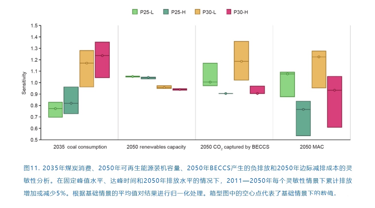 盡管BECCS技術的部署受到累計排放量變化的重大影響,但提前達峰能夠減少對碳移除技術的依賴并減少由累計排放量不確定性帶來的波動。由于所有部門在2050年都已經深度脫碳,因此所有情景都顯示出了對BECCS的巨大需求,其中P25-L和P30-L情景有更高的普及率。與碳移除技術類似,MAC受到累計排放量的影響較大。較晚達峰和更嚴格的長期排放目標都會增加MAC,產生更大的減排壓力,提前達峰能夠在實現(xiàn)長期目標中占據(jù)主動地位。