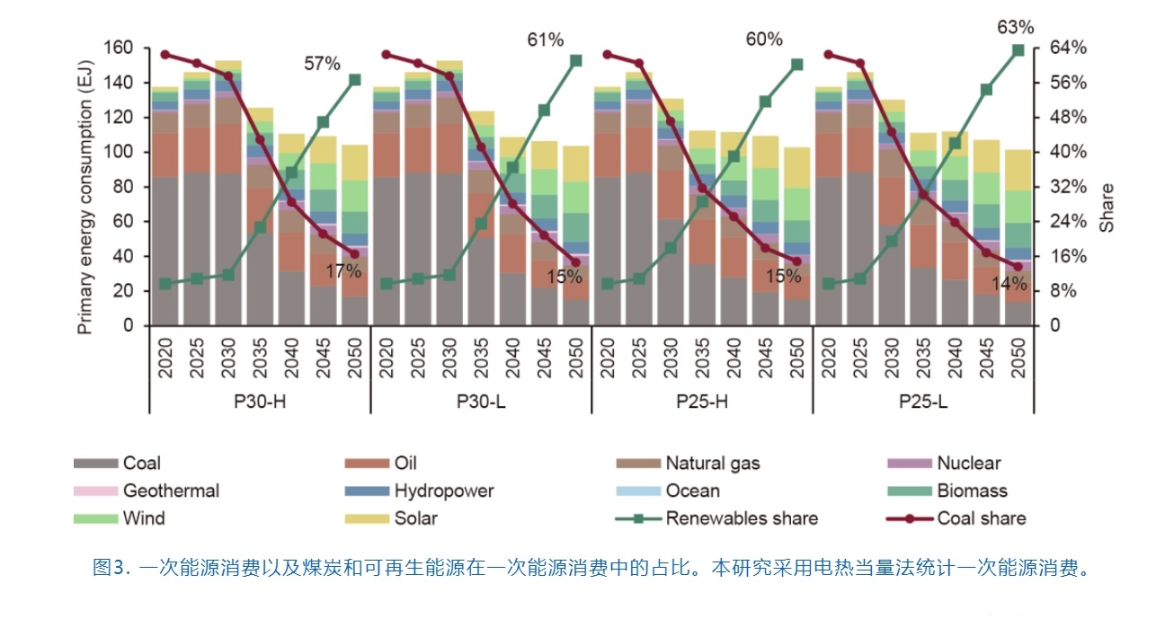 相比之下,可再生能源目前占一次能源消費的10%,同時增長緩慢,主要是為了滿足增量能源需求。未來,可再生能源將最有希望填補由煤炭消費下降造成的缺口,從而逐步取代化石燃料。據(jù)測算,在2035—2040年,可再生能源將超越化石燃料,成為中國最主要的能源。到2050年,中國一次能源消費中可再生能源比重將達到約60%。同樣,對于2050年碳預算較低或者開始減排較早的情景(P25-L、P25-H和P30-L),可再生能源的占比將更高。