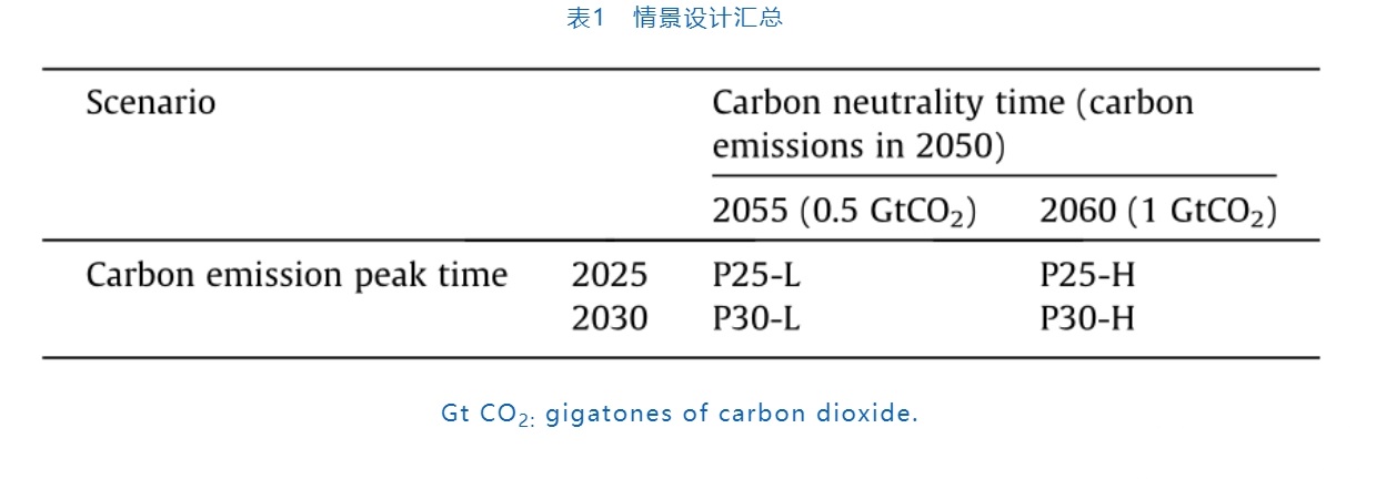 中國最新的長期氣候目標是2030年前實現(xiàn)二氧化碳排放達峰,到2060年實現(xiàn)碳中和。為了探討碳達峰時間和碳中和時間差異對能源系統(tǒng)轉型的影響,本文設計了以下4個轉型情景(表1)。