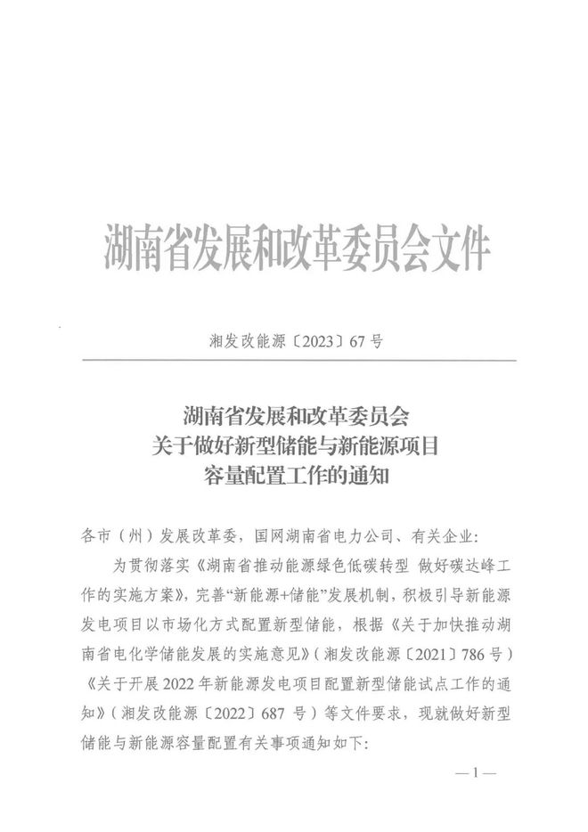 按照湖南發(fā)改委相關(guān)文件,新能源項目應(yīng)配置一定容量的新型儲能,于2022年12月底前,2023年6月底前全容量并網(wǎng)運行的新型儲能試點項目分別按其裝機容量的1.5倍、1.3倍計算所配新能源容量。