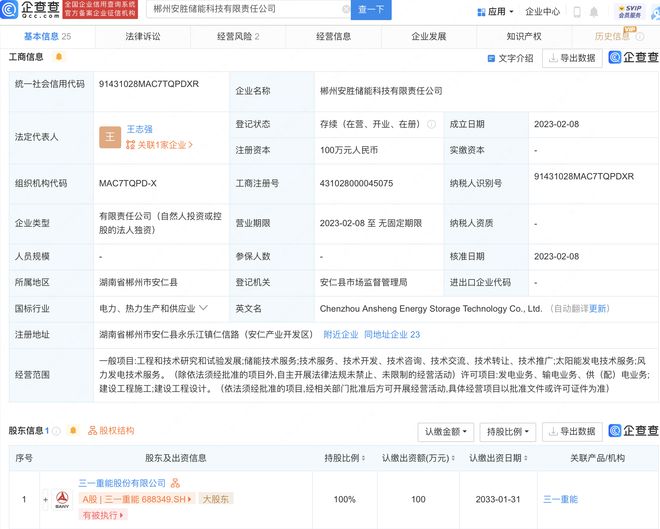 近日,郴州安勝儲(chǔ)能科技有限責(zé)任公司成立,法定代表人為王志強(qiáng),注冊(cè)資本100萬元人民幣,經(jīng)營(yíng)范圍包含:儲(chǔ)能技術(shù)服務(wù);太陽(yáng)能發(fā)電技術(shù)服務(wù);風(fēng)力發(fā)電技術(shù)服務(wù)等。企查查股權(quán)穿透顯示,該公司由三一重能100%控股。