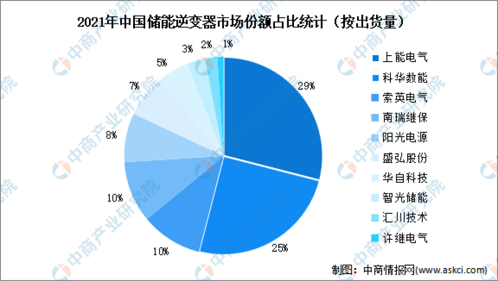 2021年中國新增投運(yùn)的新型儲能項(xiàng)目中,裝機(jī)規(guī)模排名前十位的儲能逆變器提供商依次為:上能電氣、科華數(shù)能、索英電氣、南瑞繼保、陽光電源、盛弘股份、華自科技、智光儲能、匯川技術(shù)和許繼電氣。其中,上能電氣、科華數(shù)能市場份額占比分別為29%、25%。