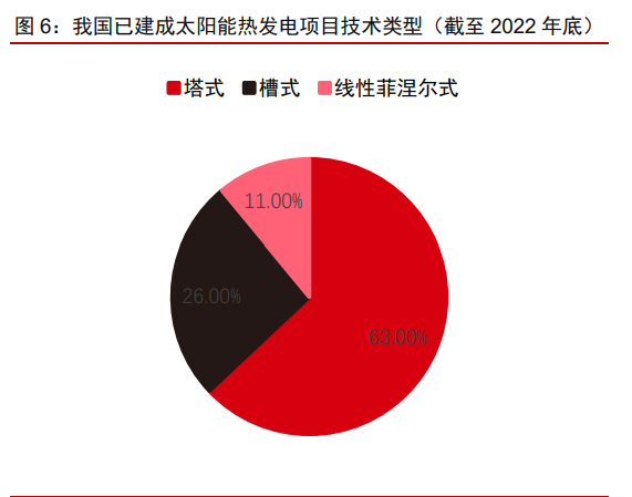 我國(guó)已建成光熱項(xiàng)目中,塔式光熱占比相對(duì)較高。根據(jù) CSTA 數(shù)據(jù),截至 2021 年底, 全球太陽(yáng)能熱發(fā)電累計(jì)裝機(jī)容量達(dá)到 6.8GW,槽式、塔式、線性菲涅耳技術(shù)裝機(jī)在全球主 要國(guó)家和地區(qū)的占比為 76%、20%和 4%。截至 2022 年底,我國(guó)太陽(yáng)能熱發(fā)電累計(jì)裝機(jī) 容量為 588MW(含 MW 級(jí)以上規(guī)模的發(fā)電系統(tǒng)),塔式光熱電站雖然前期系統(tǒng)建設(shè)一次性投資較大且維護(hù)成本較高,但更適合我國(guó)西部地區(qū)晝夜溫差大、缺少水資源、自然環(huán)境 惡劣等特點(diǎn),同時(shí)因槽式系統(tǒng)和線菲式系統(tǒng)集熱效率偏低、對(duì)工質(zhì)加熱能力較弱等因素, 因而在我國(guó)塔式光熱電站應(yīng)用范圍相對(duì)較廣。