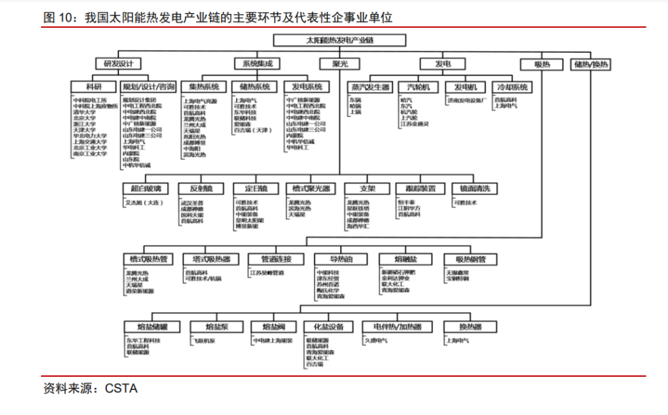 光熱發(fā)電產(chǎn)業(yè)鏈體系可分為研發(fā)、設(shè)計(jì)、制造、安裝等環(huán)節(jié),產(chǎn)業(yè)鏈國(guó)產(chǎn)化程度較高。 根據(jù) CSTA 數(shù)據(jù)顯示,在國(guó)家第一批光熱發(fā)電示范項(xiàng)目中,設(shè)備、材料國(guó)產(chǎn)化率超過(guò) 90%, 技術(shù)及裝備的可靠性和先進(jìn)性在電站投運(yùn)后得到有效驗(yàn)證;在青海中控德令哈 50MW 塔 式光熱發(fā)電項(xiàng)目中,設(shè)備和材料國(guó)產(chǎn)化率已達(dá)到 95%以上。