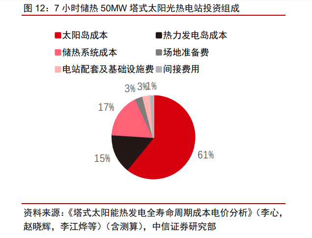 塔式太陽(yáng)能熱電站中太陽(yáng)島建設(shè)成本是電站建設(shè)的主要成本。太陽(yáng)能熱發(fā)電站建造成 本主要分設(shè)備費(fèi)、安裝費(fèi)和土建費(fèi)三部分。綜合《塔式太陽(yáng)能熱發(fā)電全壽命周期成本電價(jià) 分析》(李心,趙曉輝,李江燁等著)的測(cè)算數(shù)據(jù)來(lái)看,對(duì)于 10MW 以上的塔式太陽(yáng)能熱 發(fā)電站而言,太陽(yáng)島(含聚光系統(tǒng)和吸熱系統(tǒng))成本占電站建造成本的 55%以上;以 50MW 塔式太陽(yáng)能熱發(fā)電電站為例,其太陽(yáng)島成本高達(dá) 61%,熱力發(fā)電島(含熱力系統(tǒng)及輔機(jī)設(shè) 備、水循環(huán)、水處理系統(tǒng)、換熱設(shè)備、熱工控制系統(tǒng)、電氣系統(tǒng)、電網(wǎng)接入系統(tǒng)及儀表閥 門(mén)管路等)成本約 15%,儲(chǔ)熱系統(tǒng)成本約 17%。