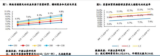 并且在容量租賃獎(jiǎng)勵(lì)為1.3倍和1.5倍時(shí),其資本金收益率能夠放大至11.1%與13.5%。考慮到當(dāng)前湖南省仍存在較大的電 網(wǎng)側(cè)儲(chǔ)能裝機(jī)缺口,調(diào)峰服務(wù)輔助頻次和價(jià)格均有望實(shí)現(xiàn)較大的提升,在不考慮容量租賃獎(jiǎng)勵(lì)的情況下,其資本金收益在年調(diào)用次 數(shù)為330次,調(diào)峰輔助服務(wù)收益為0.4元/kWh的情況下,其資本金收益率能夠達(dá)到9.8%。隨著電力輔助服務(wù)種類(lèi)增多和電力現(xiàn)貨市場(chǎng) 的開(kāi)展,其收益方式有望進(jìn)一步增加。同時(shí)儲(chǔ)能電站的收益在一定程度上依賴(lài)電站運(yùn)營(yíng)商自身的運(yùn)營(yíng)水平,隨著儲(chǔ)能電站運(yùn)營(yíng)商的 經(jīng)驗(yàn)積累,收益能力有望進(jìn)一步提升。