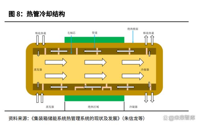 相變材料和熱管冷卻仍處于在研階段,成本和穩(wěn)定性是影響其投產(chǎn)的重要原 因。相變材料冷卻是使電池單體直接接觸相變材料,利用其相變過程吸收熱 量實現(xiàn)對鋰離子電池的冷卻。相變材料冷卻可以明顯提升儲能系統(tǒng)溫度分布 的均勻性,但其價格較高,且當相變材料吸熱時,其體積變化明顯,容易對 儲能系統(tǒng)的工作性能產(chǎn)生影響。熱管是一種利用介質在吸熱端的蒸發(fā)帶走熱 量,再在放熱端通過冷凝的方式將熱量傳遞到外界的裝置,這一冷卻技術已 相對成熟,但其成本較高,在手機等電子設備上使用較多,應用于儲能系統(tǒng) 上性價比低。