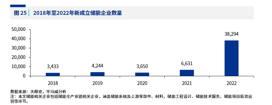 最近,特斯拉儲(chǔ)能超級(jí)工廠(chǎng)落戶(hù)上海、知名酒企五糧液擬跨界儲(chǔ)能,小米、華為等企業(yè)均增設(shè)部門(mén)聚焦,儲(chǔ)能賽道可謂是炙手可熱,無(wú)論是在制造環(huán)節(jié),還是在終端應(yīng)用市場(chǎng),數(shù)萬(wàn)家企業(yè)正搶占布局。據(jù)畢馬威中國(guó)與中國(guó)電力企業(yè)聯(lián)合會(huì)聯(lián)合發(fā)布的《新型儲(chǔ)能助力能源轉(zhuǎn)型》顯示,2021年之前,我國(guó)每年新成立的儲(chǔ)能相關(guān)企業(yè)大約在三四千家。隨著儲(chǔ)能行業(yè)的迅速升溫,2022年成立了38294家儲(chǔ)能相關(guān)企業(yè),是2020年新成立儲(chǔ)能企業(yè)數(shù)量的10倍,是2021年的近6倍。