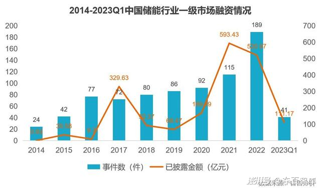 在投融資上,儲能行業(yè)也成為一級市場投資新熱點(diǎn),其熱度持續(xù)高漲,尤其是2022年,儲能融資處于爆發(fā)期。據(jù)睿獸分析統(tǒng)計,2022年,我國儲能行業(yè)融資事件189件,同比增長64.3%,融資金額520.97億元,也處于高位。