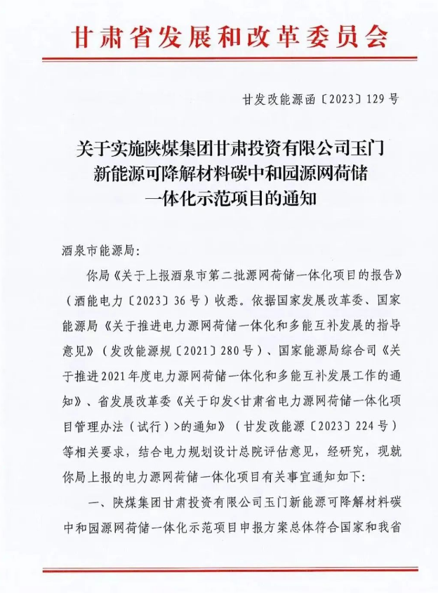近日,從甘肅省發(fā)改委傳來喜訊,由陜煤集團(tuán)甘肅投資有限公司(以下簡稱:甘肅投資公司)申報(bào)的“玉門新能源可降解材料碳中和產(chǎn)業(yè)園源網(wǎng)荷儲(chǔ)一體化項(xiàng)目”獲批,標(biāo)志著全國最大、陜煤集團(tuán)“十四五”發(fā)展規(guī)劃首批、甘肅投資公司首個(gè)源網(wǎng)荷儲(chǔ)一體化項(xiàng)目正式落地。