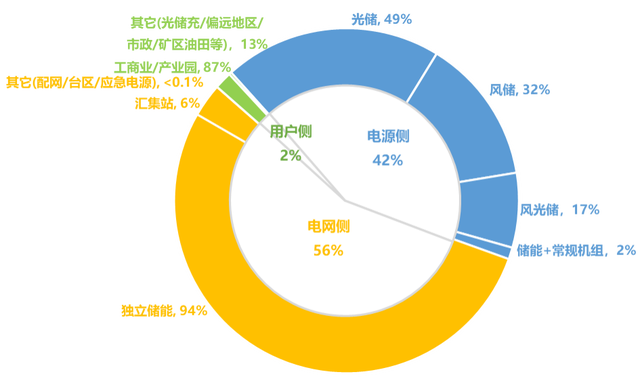 中國(guó)新增投運(yùn)新型儲(chǔ)能項(xiàng)目應(yīng)用裝機(jī)分布(2023年1-6月份,MW%)
