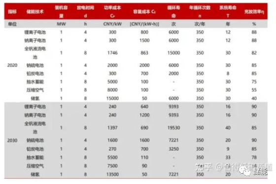 為了對(duì)比各類儲(chǔ)能技術(shù)度電成本的變化趨勢(shì),首先對(duì)各類技術(shù)到 2030 年的儲(chǔ) 能容量、能量單元成本、使用壽命、充放電效率等進(jìn)行假設(shè):