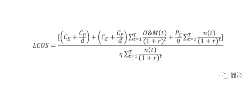 相類似地,儲(chǔ)能的全生命周期成本即平準(zhǔn)化儲(chǔ)能成本(Levelized Cost of Storage,LCOS)。LCOS 可以概括為一項(xiàng)儲(chǔ)能技術(shù)的全生命周期成本除以其累計(jì)傳輸?shù)碾娔芰炕螂姽β剩从沉藘衄F(xiàn)值為零時(shí)的內(nèi)部平均電價(jià),即該項(xiàng)投資的盈利點(diǎn)。平準(zhǔn)化儲(chǔ)能成本(LCOS)量化了特定儲(chǔ)能技術(shù)和應(yīng)用場(chǎng)景下單位放電量的折現(xiàn)成本,考慮了影響放電壽命成本的所有技術(shù)和經(jīng)濟(jì)參數(shù),可以與平準(zhǔn)化度電成本 (LCOE)類比,是進(jìn)行儲(chǔ)能技術(shù)成本比較的合適工具。