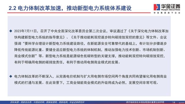 2023年7月11日,召開了中央全面深化改革委員會第二次會議,審議通過了《關(guān)于深化電力體制改革加快構(gòu)建新型電力系統(tǒng)的指導(dǎo)意見》、《關(guān)于推動能耗雙控逐步轉(zhuǎn)向碳排放雙控的意見》等文件。會議強調(diào)“要科學(xué)合理設(shè)計新型電力系統(tǒng)建設(shè)路徑,在新能源安全可靠替代的基礎(chǔ)上,有計劃分步驟逐步降低傳統(tǒng)能源比重。要健全適應(yīng)新型電力系統(tǒng)的體制機制,推動加強電力技術(shù)創(chuàng)新、市場機制創(chuàng)新、商業(yè)模式創(chuàng)新”等。新型電力系統(tǒng)是能源綠色低碳轉(zhuǎn)型的關(guān)鍵支撐,推動能耗雙控轉(zhuǎn)向碳排放雙控,有利于明確用電側(cè)的碳排放責(zé)任,有利于推動用電側(cè)商業(yè)模式的發(fā)展。