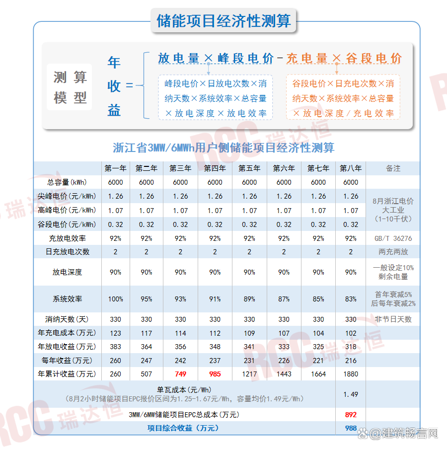 RCC瑞達(dá)恒研究院基于8月份的電價(jià)及儲(chǔ)能項(xiàng)目EPC中標(biāo)均價(jià)等數(shù)據(jù),以浙江省某化纖生產(chǎn)公司3MW/6MW的用戶側(cè)儲(chǔ)能項(xiàng)目為例進(jìn)行經(jīng)濟(jì)性測(cè)算得出:該項(xiàng)目約3.5年便可回收項(xiàng)目建設(shè)成本,按項(xiàng)目運(yùn)行周期8年測(cè)算,項(xiàng)目可為業(yè)主節(jié)省988萬(wàn)元的電費(fèi)。