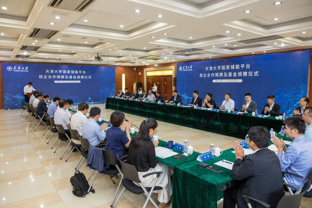 10月1日,天津大學(xué)國家儲(chǔ)能平臺(tái)校企合作揭牌及基金捐贈(zèng)儀式在天津大學(xué)衛(wèi)津路校區(qū)舉行。國網(wǎng)天津市電力公司黨委書記、董事長趙亮,國網(wǎng)天津市電力公司黨委委員、副總經(jīng)理莊劍,中國電力科學(xué)研究院三級(jí)顧問陳竟成,沃太能源股份有限公司總裁王珺,中自環(huán)保科技股份有限公司董事長陳啟章,平高集團(tuán)儲(chǔ)能科技有限公司董事長田剛領(lǐng),西安西瑞控制技術(shù)股份有限公司副總經(jīng)理、總工程師王海吉,廣州烯灣氫能科技有限公司運(yùn)營副總裁馮羽參會(huì)。中國工程院院士、天津大學(xué)校長金東寒,中國工程院院士、國家儲(chǔ)能平臺(tái)主任王成山,校黨委常委、副校長鞏金龍,校黨委常委、副校長王天友,學(xué)工部、教務(wù)處、研究生院、科研院、校友與基金事務(wù)處、自動(dòng)化學(xué)院、未來技術(shù)學(xué)院等相關(guān)單位負(fù)責(zé)人以及部分教師、學(xué)生代表出席儀式。儀式由天津大學(xué)國家儲(chǔ)能平臺(tái)常務(wù)副主任焦魁主持。