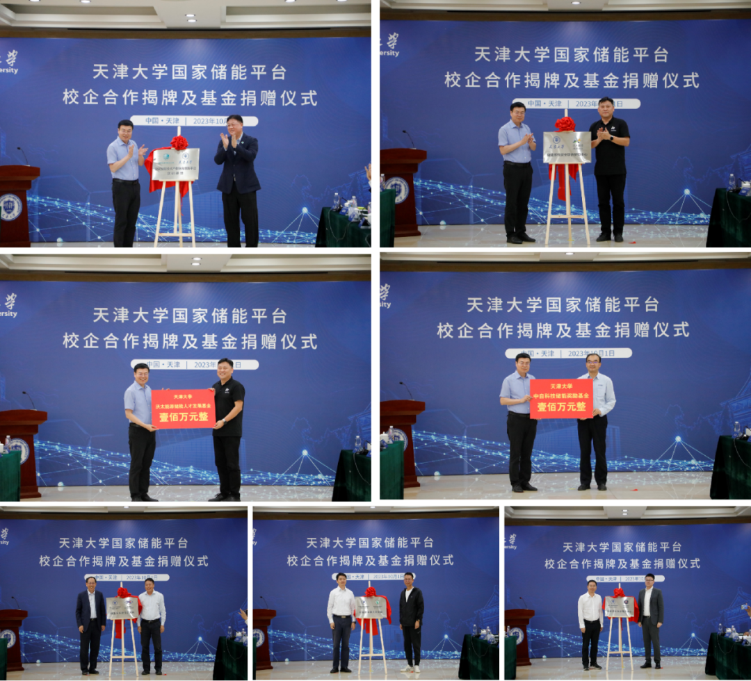 儀式上,校企雙方領(lǐng)導(dǎo)共同為國網(wǎng)天津市電力公司—天津大學(xué)國家儲(chǔ)能平臺(tái)實(shí)訓(xùn)基地、天津大學(xué)—沃太能源儲(chǔ)能系統(tǒng)安全聯(lián)合研究中心、天津大學(xué)國家儲(chǔ)能平臺(tái)—平高儲(chǔ)能科技儲(chǔ)能技術(shù)聯(lián)合研究院、天津大學(xué)國家儲(chǔ)能平臺(tái)—西瑞控制儲(chǔ)能技術(shù)聯(lián)合研究院、天津大學(xué)國家儲(chǔ)能平臺(tái)—烯灣氫能科技?xì)淠芗夹g(shù)聯(lián)合研究中心揭牌,相關(guān)企業(yè)將在未來三年向天津大學(xué)投入至少1900萬元經(jīng)費(fèi)用于儲(chǔ)能技術(shù)領(lǐng)域的科技攻關(guān)和成果轉(zhuǎn)化。沃太能源股份有限公司總裁、天津大學(xué)2023級(jí)能源動(dòng)力專業(yè)工程博士王珺向天津大學(xué)捐贈(zèng)沃太能源儲(chǔ)能人才發(fā)展基金100萬元,中自科技董事長、天津大學(xué)四川校友會(huì)執(zhí)行會(huì)長,自動(dòng)化學(xué)院1982級(jí)工業(yè)自動(dòng)化專業(yè)校友陳啟章向天津大學(xué)捐贈(zèng)中自科技儲(chǔ)能獎(jiǎng)勵(lì)基金100萬元,相關(guān)基金將用于天津大學(xué)國家儲(chǔ)能平臺(tái)獎(jiǎng)學(xué)金、獎(jiǎng)教金等事宜,助力學(xué)校事業(yè)發(fā)展。