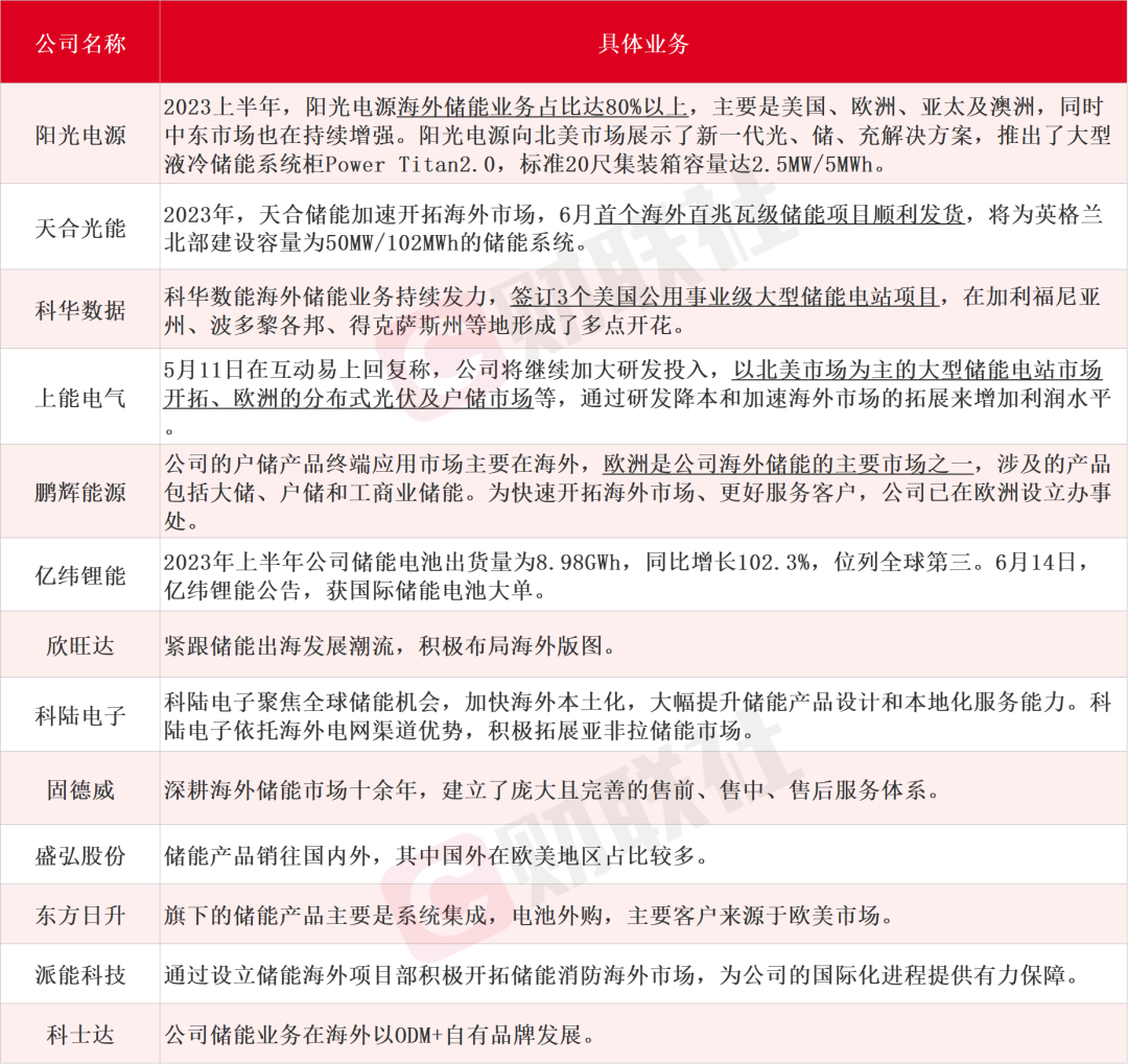 業(yè)內(nèi)人士表示,隨著2023年美國(guó)光伏裝機(jī)重新恢復(fù)增長(zhǎng)及ITC補(bǔ)貼力度的加大,預(yù)計(jì)美國(guó)儲(chǔ)能需求將恢復(fù)翻倍以上的增速。對(duì)此,不少儲(chǔ)能企業(yè)紛紛加速“出海”,以全面進(jìn)軍海外市場(chǎng)為主要目標(biāo)。據(jù)財(cái)聯(lián)社不完全整理,在海外有布局儲(chǔ)能相關(guān)業(yè)務(wù)的上市公司主要為陽光電源、天合光能、科華數(shù)據(jù)、上能電氣、鵬輝能源、億緯鋰能、欣旺達(dá)、科陸電子、固德威、盛弘股份、東方日升、派能科技、科士達(dá)等,具體情況如下: