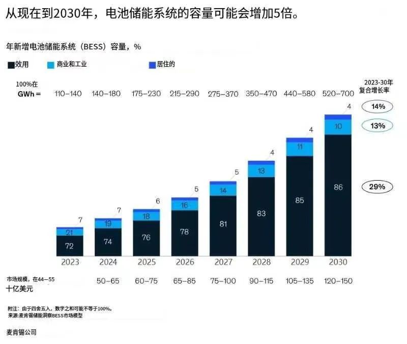 我們預(yù)計,公用事業(yè)規(guī)模的電化學(xué)儲能(已占新增年產(chǎn)能的大部分)將在未來六年中每年都增長29%左右,是三個細(xì)分市場中增長最快的。預(yù)計到2030年,公用事業(yè)規(guī)模的年度裝機(jī)容量將達(dá)到450至620吉瓦時(GWh),公用事業(yè)規(guī)模的電化學(xué)儲能將占據(jù)當(dāng)年總市場的90%。