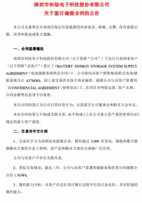 據(jù)悉,交易對手方為美洲知名能源企業(yè),擁有超過2,000名發(fā)電、儲能和數(shù)字能源解決方案的專業(yè)工程師,其產(chǎn)品和解決方案在全球被廣泛應(yīng)用。公告顯示,最近三年,科陸電子與該客戶簽署的儲能系統(tǒng)供貨合同規(guī)模合計約1.5GWh。