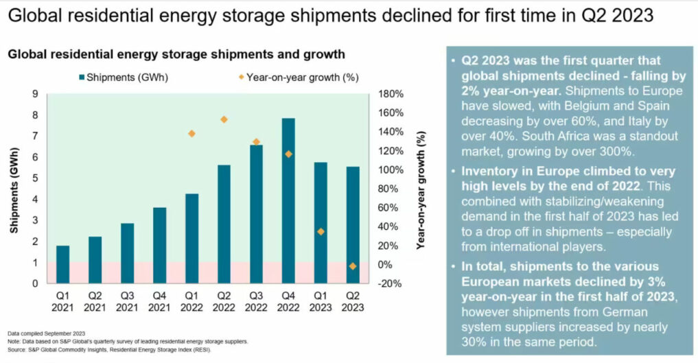 標準普爾全球(S&P Global)公司在日前發(fā)布的一份研究報告指出,在能源價格波動較小、庫存高企以及成本上升的背景下,全球戶用儲能系統(tǒng)出貨量在2023年第二季度首次同比下降。