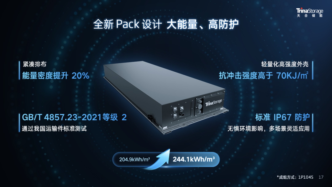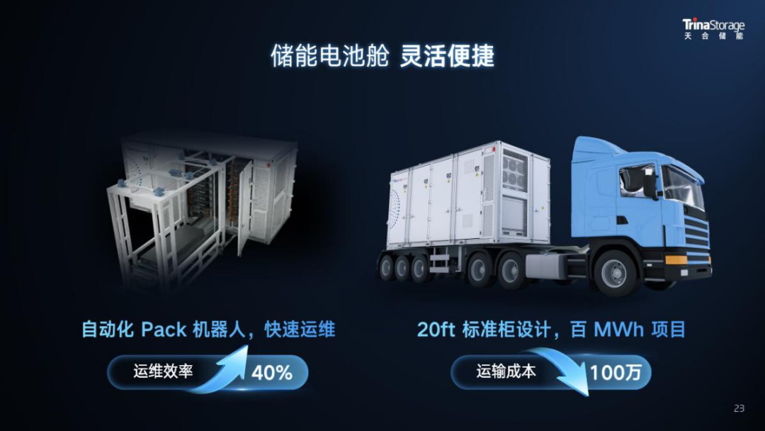 5MWh儲(chǔ)能系統(tǒng)在降本增效上具有突出優(yōu)勢(shì),如更低的度電成本、更優(yōu)的組合方案,標(biāo)準(zhǔn)尺寸下更高的能量密度。同時(shí),也面臨著一些挑戰(zhàn),如電芯一致性與電池簇間能量均衡管理,更大Pack設(shè)計(jì)下對(duì)于結(jié)構(gòu)、散熱、安全設(shè)計(jì)的挑戰(zhàn)以及約40噸重量運(yùn)輸?shù)碾y題。天合儲(chǔ)能著眼當(dāng)前市場(chǎng)需求,創(chuàng)新提出天合方案。