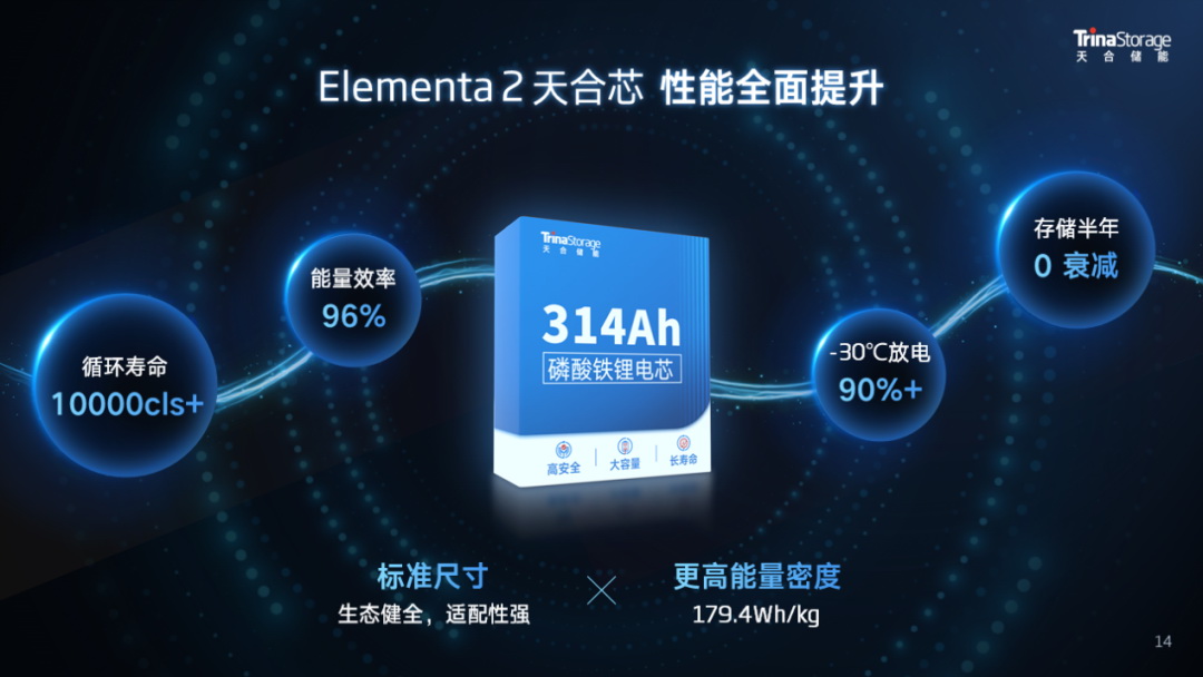 通過優(yōu)化電芯結(jié)構(gòu)和智造工藝,天合自研高安全、高能量密度的314Ah儲(chǔ)能專用電芯,循環(huán)壽命可達(dá)10000cls+,能量密度179.4Wh/kg,能量效率高達(dá)96%,同時(shí)采用主流標(biāo)準(zhǔn)的71173尺寸,完美適配當(dāng)前主流系統(tǒng)集成方案,實(shí)現(xiàn)同尺寸下系統(tǒng)能量的顯著提升。