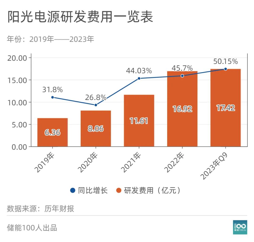 事實上,陽光電源自1997年成立起,26年來一直不斷加大科研投入,時刻不忘技術(shù)創(chuàng)新。截至目前,其在合肥、上海、南京、深圳、德國、荷蘭有六大研發(fā)中心,研發(fā)人員占比40%,2023年前三季度研發(fā)費用投入17.42億元。申請專利5300余項,持有數(shù)業(yè)內(nèi)第一。