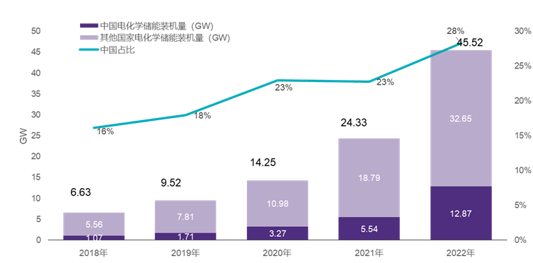 電化學(xué)儲能市場近年來裝機規(guī)模顯著提高。從全球范圍來看,2018年的裝機量是6.63GW,而到了2022年,這個數(shù)字已經(jīng)大幅增長到45.52GW。其中,中國市場的占比也有顯著提升,從2018年的16%增長到2022年的28%。