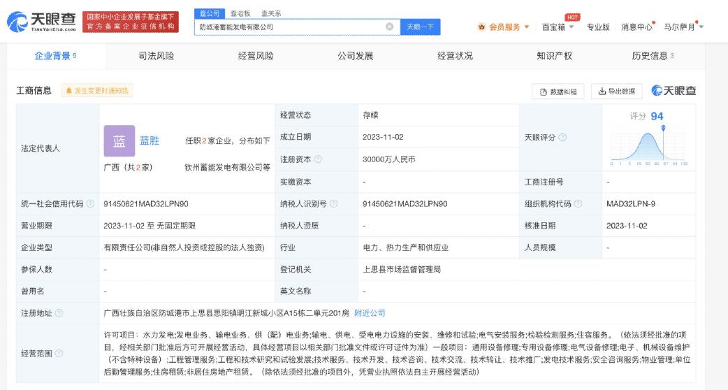 南方財經(jīng)11月7日電,天眼查App顯示,近日,防城港蓄能發(fā)電有限公司成立,法定代表人為藍勝,注冊資本3億人民幣,經(jīng)營范圍含水力發(fā)電、電氣安裝服務、通用設備修理、電氣設備修理、工程管理服務、發(fā)電技術服務、單位后勤管理服務、非居住房地產(chǎn)租賃等。股東信息顯示,該公司由南網(wǎng)儲能全資持股。