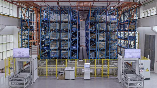 為了更好地提升倉內(nèi)空間利用率,在進(jìn)行現(xiàn)場測量與規(guī)劃后,京東物流通過投入使用堆垛機(jī)、智能升降貨柜、料箱AGV等智能設(shè)備為其進(jìn)行了一系列軟硬件改造升級(jí),最大程度利用場地空間,建設(shè)超萬個(gè)儲(chǔ)位,儲(chǔ)位最高可放置重量達(dá)1000公斤的物資。與此同時(shí),京東物流還全面利用人臉識(shí)別技術(shù),語音播報(bào)、燈光指引、智能墨水屏、重力式感應(yīng)貨架等硬件,部署智能軟件系統(tǒng),實(shí)現(xiàn)24小時(shí)無人化值守,提高領(lǐng)料效率,確保安全生產(chǎn)。