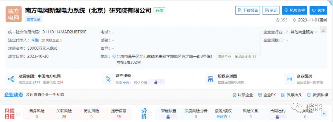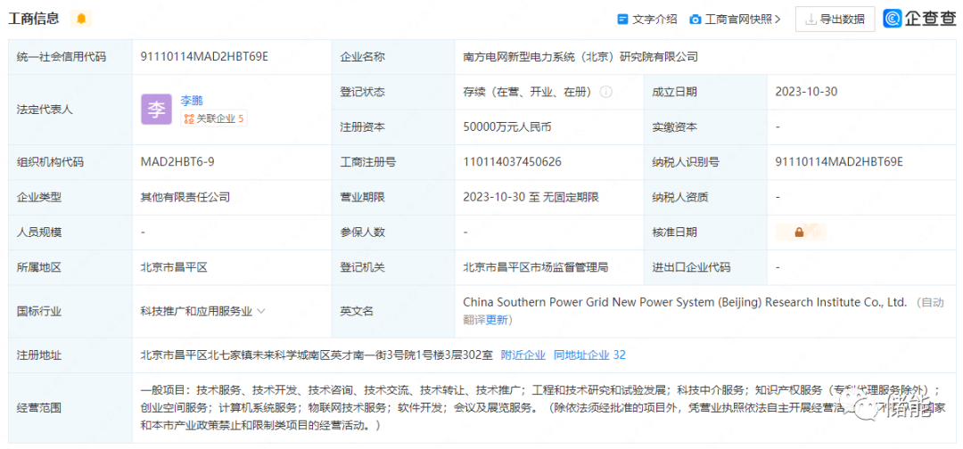 10月30日,南方電網新型電力系統(tǒng)(北京)研究院有限公司注冊成立,法定代表人為李鵬,注冊資本5億元人民幣,該公司由中國南方電網有限責任公司及旗下南方電網數(shù)字電網集團有限公司、南方電網科學研究院有限責任公司共同持股。