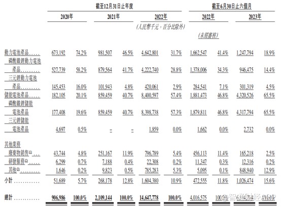 其中,儲能電池產(chǎn)品占營業(yè)收入的比重連續(xù)增長,2020年至2022年分別為20.1%、40.7%、57.4%;動力電池產(chǎn)品的占比則在報告期內(nèi)有所下降,分別為74.2%、46.5%、31.7%。截至2023年前6個月,動力電池產(chǎn)品收入達到12.48億元,占比約為18.9%,儲能電池產(chǎn)品收入約為43.21億元,占比則為65.5%。