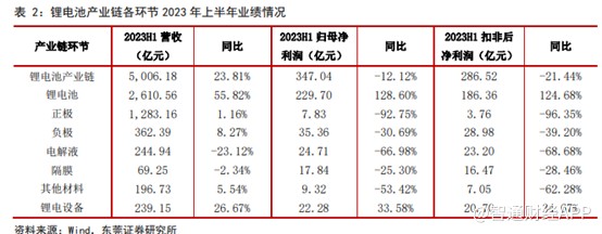 從產(chǎn)業(yè)鏈來看,電池環(huán)節(jié)上半年業(yè)績表現(xiàn)最好,盈利能力維持相對高位。據(jù)東莞證券報告,2023年上半年鋰電池環(huán)節(jié)總營收約為2610.56億元,同比增速達到55.82%。