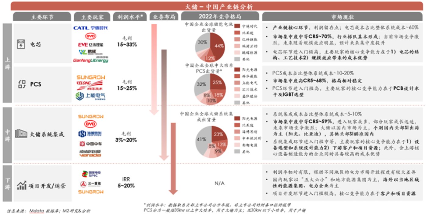 覓途咨詢的調(diào)研顯示,在大儲(chǔ)系統(tǒng)的價(jià)值鏈中,上游設(shè)備制造環(huán)節(jié)是核心的利潤(rùn)留存點(diǎn),技術(shù)壁壘高,新玩家難以進(jìn)入市場(chǎng);中游系統(tǒng)集成環(huán)節(jié)玩家眾多,市場(chǎng)競(jìng)爭(zhēng)激烈,核心競(jìng)爭(zhēng)點(diǎn)在客戶和項(xiàng)目資源開發(fā)能力,僅有個(gè)別頭部玩家以出海業(yè)務(wù)為主;未來(lái)伴隨運(yùn)營(yíng)市場(chǎng)成熟IRR提升,更多企業(yè)將向下滲透。