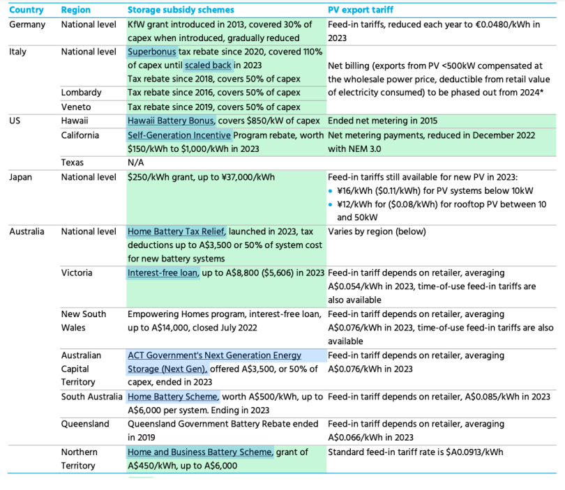注:綠色=支持戶用儲能普及的主要驅(qū)動因素。*=意大利對新光伏系統(tǒng)的凈計費政策將于2024年1月1日終止,而現(xiàn)有系統(tǒng)需要在2024年年底前逐步轉(zhuǎn)為補償較低的計劃,補償金額約為100歐元/MWh,具體取決于生產(chǎn)時間和地區(qū)。日本的光伏輸出電價適用于10-50kW的光伏系統(tǒng)。